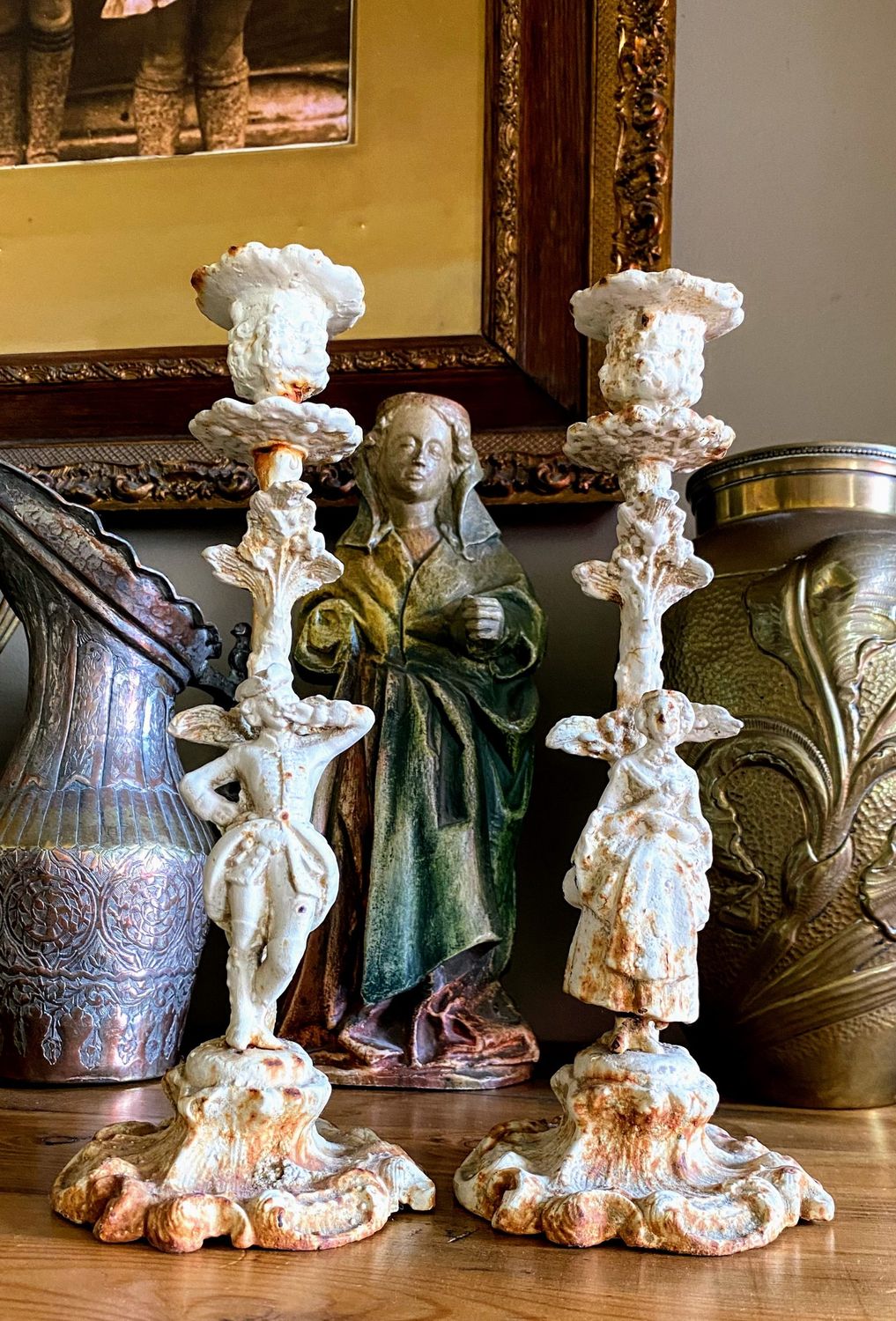 Ondanks hun leeftijd verkeren de kandelaars in een goede gebruikte conditie, waarbij de roestige patina de charme en authenticiteit van het stuk onderstreept. Dit paar vormt een uniek verzamelobject dat kunst, ambacht en historische mode samenbrengt.