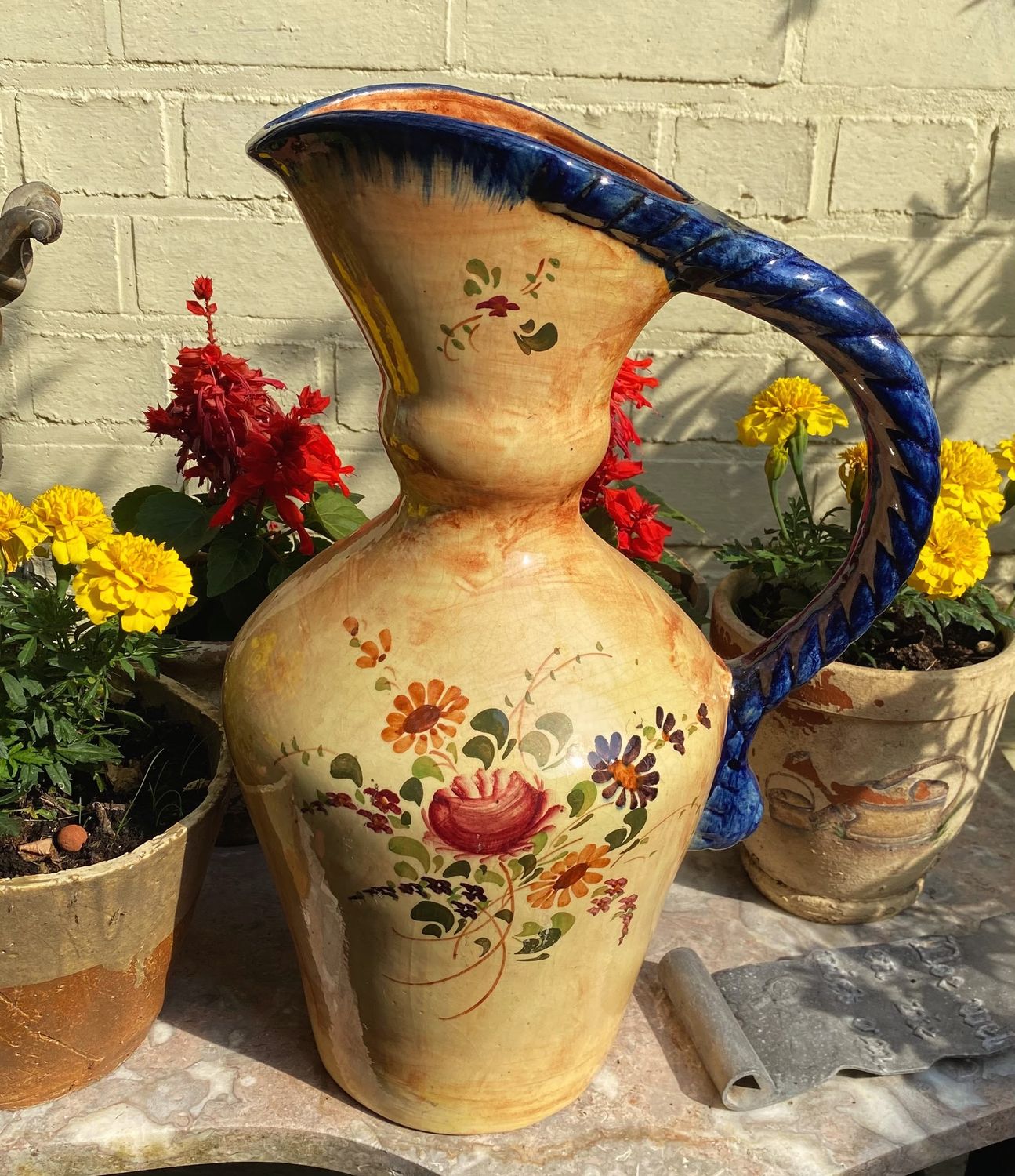 Deze imposante schenkkan is vervaardigd uit bruin gevlekt okergeel plateel aardewerk en rijkelijk voorzien van een handgeschilderd bloemen- en bladmotief. De brede tuit, beschilderd met bloemen en afgezet met een rand in blauw druipmotief, geeft het geheel een bijzondere toets.